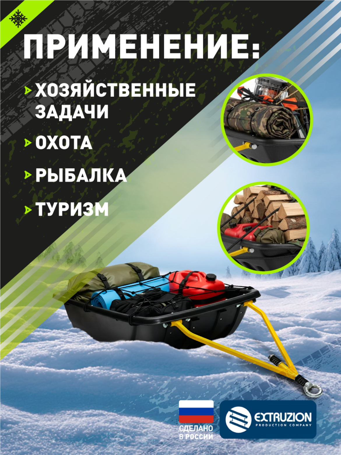 • Мощные сани-прицеп премиум-класса, укомплектованные для перевозки крупных грузов снегоходами и мотобуксировщиками. Полная готовность к работе в экстремальных условиях.