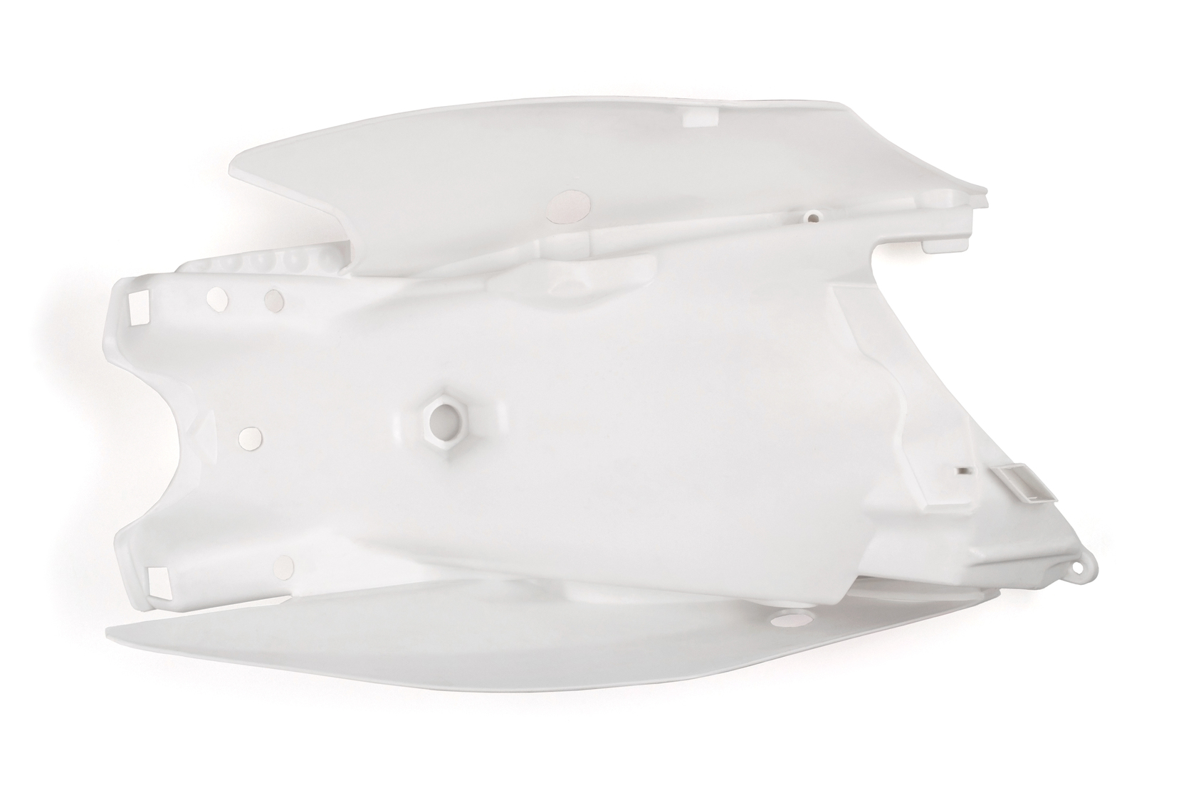 Комплект задней части хвоста (левая и правая сторона) пластика под стиль KTM SX85. Детали изготовлены из прочного и легкого ABS-пластика, идеально повторяют оригинальную форму, легко устанавливаются и обеспечивают надёжную защиту. Комплект выполнен в белом цвете и дополнен наклейками.