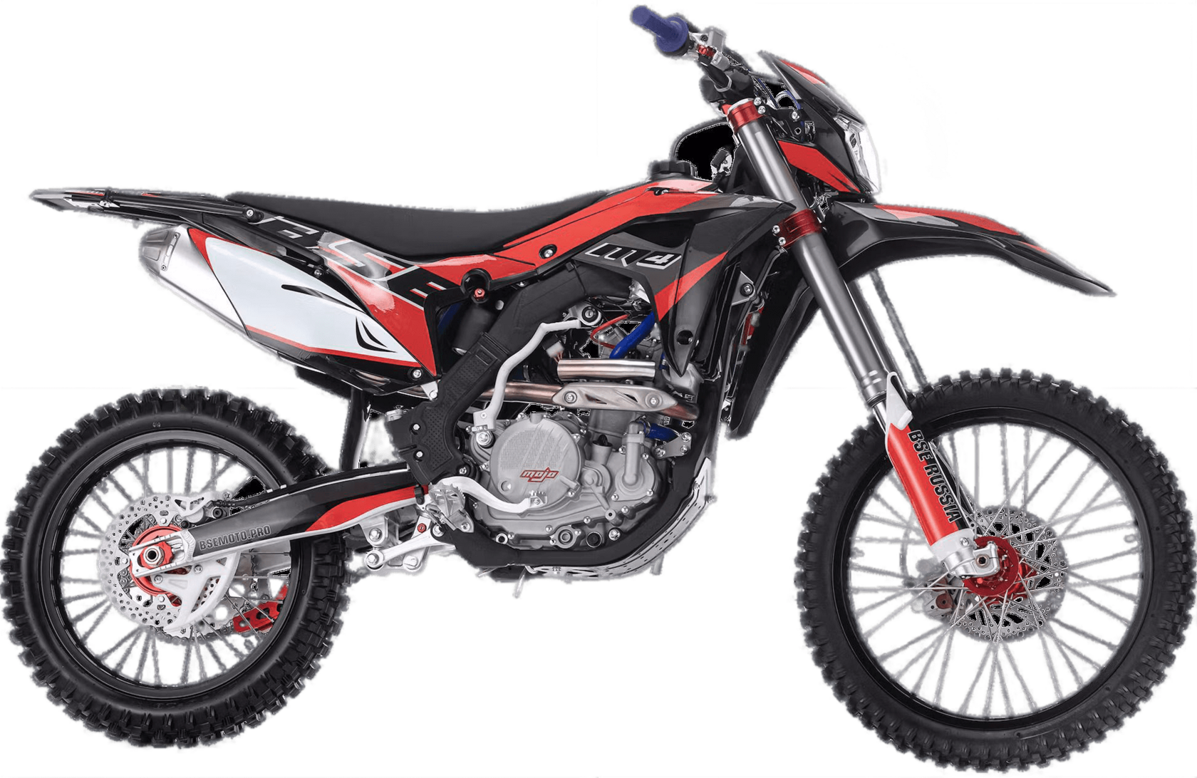 Сердце M4 – мощный, эластичный и надежный 250 кубовый Zongshen ZS 177 FMM мощностью 27 лс с водяным охлаждением. Отличные показатели крутящего момента во всем диапазоне оборотов. Система подачи топлива – спортивный карбюратор NIBBI RACING 34. На мотоцикле установлена спортивная выхлопная алюминиевая система увеличенного диаметра. Имеется вентилятор охлаждения. Коробка передач - 6 ступенчатая механическая. Рама M4 - оригинальная, многосоставная, алюминиевая и невероятно крепкая. Рама запатентованной заводом Bosuer. M4 уже в заводской комплектации готов к покорению серьезного бездорожья и участия в соревнованиях. Подвеска MOJO c большими ходами имеет полный диапазон регулировок и помогает отрабатывать даже самые жесткие приземления, с лёгкостью "проглатывает" все неровности. Установлена вилка “перевертыш” Mojo Racing c “толстыми” перьями диаметром 57 мм с двумя картриджами. Идеальная развесовка и сбалансированность конструкции мотоцикла даёт преимущество при прохождении острых поворотов и подъёмов. На мотоцикле установлено все необходимое для оффроуда: литые рычаги задней прогрессии, алюминиевый маятник, прочный задний бугель, “злая” внедорожная резина. А также: усиленные легкосплавные колёсные диски MOJO, усиленная цепь, защита рук, датчик моточасов, прочные алюминиевые облегченные ступицы MOJO, складные СNC рычаги тормоза и сцепления, колесные подшипники NTN, защита коллектора, картера двигателя и тормозных дисков. Мощная гидравлическая тормозная система HSК Racing с тормозными дисками с увеличенной вентиляцией остановит байк в любых условиях. На BSE M4 также можно с комфортном отправиться в продолжительное путешествие благодаря удобному сиденью, широкому спортивному рулю MOJO, наличию электростартера и топливному баку на 6.5 литра. C яркой LED фарой головного света можно кататься в ночное время. Хочется также отметить современный дизайн мотоцикла. Идеально сбалансированный, устойчивый, крепкий мотоцикл. Ставший уже классикой в мире мотокросса и эндуро среди китайских производителей. Ваши возможности на бездорожье безграничны! Будь то кроссовый трек, соревнования по хард эндуро, либо серьезная покатушка по бездорожью