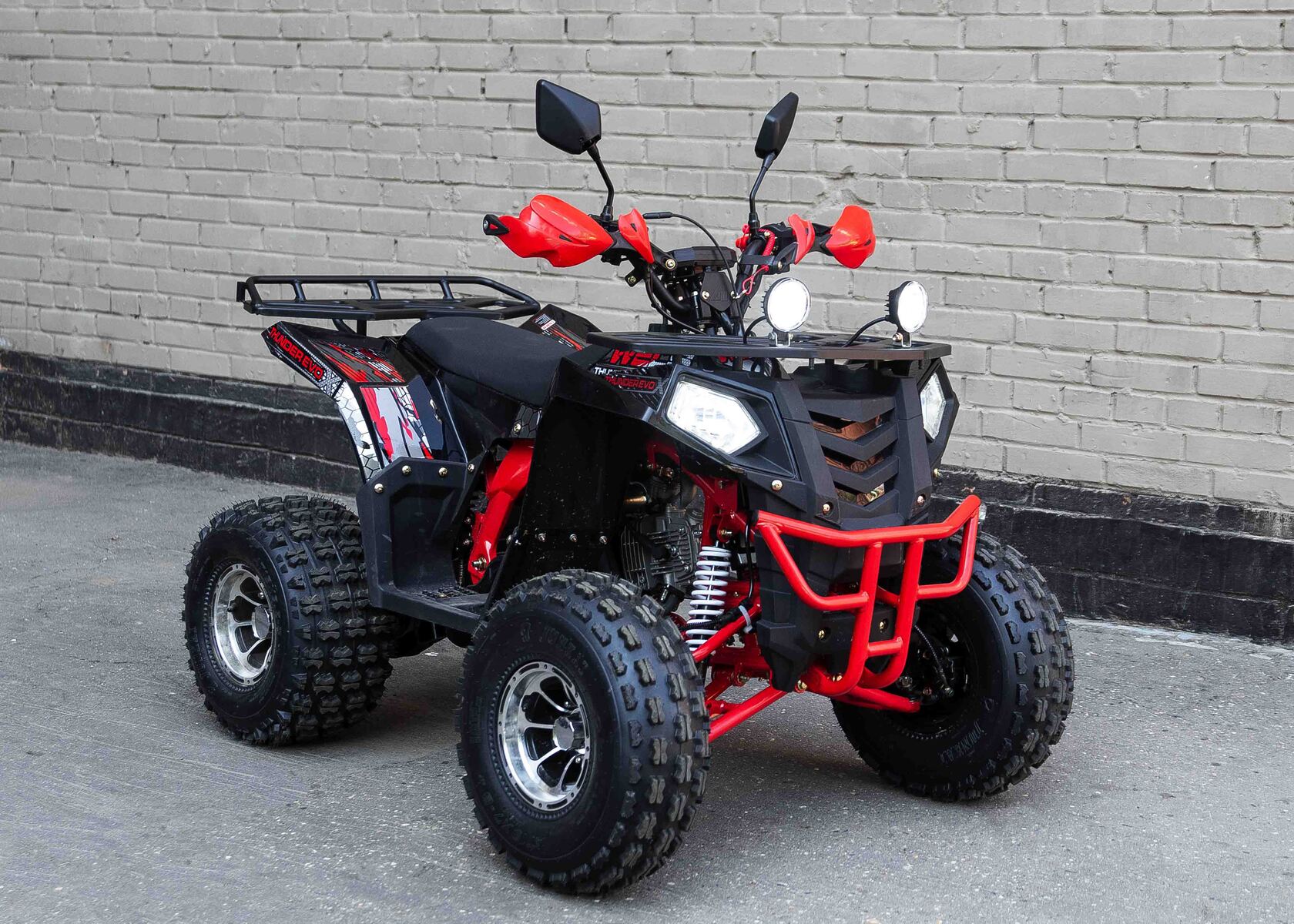 Стильная современная новинка 2019 года от компании WELS - квадроцикл для детей и подростков WELS THUNDER EVO X 125 предназначен для детей и подростков и обладает всеми необходимыми характеристиками, чтобы ребенок чувствовал себя на рулем настоящего квадроцикла, а его родители при этом были бы спокойны за безопасность юного пилота. ЛЮКСовая версия отличается от обычной наличием зеркал, дополнительной светодиодной оптики, спортивным глушителем, также квадроцикл укомплектован песочной резиной.125 кубового мотора вполне хватает для непоседливых гонщиков. Если же Вам кажется, что этого много - воспользуйтесь ограничителем скорости.Дисковые тормоза спереди и сзади обеспечат своевременную остановку перед препятствием.Защита рук в комплектации оградит ребенка от ударов веток и других помех.Песочная резина. Большие колеса 19,7-8, зад.: 18,9.5-8.Наличие укрепленных багажников спереди и сзади позволит установить на квадроцикл кофр и выезжать на природу с необходимым набором вещей и инструментов.Светодиодные фары для передвижения в темное время суток.Моточасы, светодиодные фары, звуковой сигнал, колпаки - все включено в комплектацию.Доступен в расцветках: черно-красный, бело-красный, живописно-красный, зеленый камуфляж