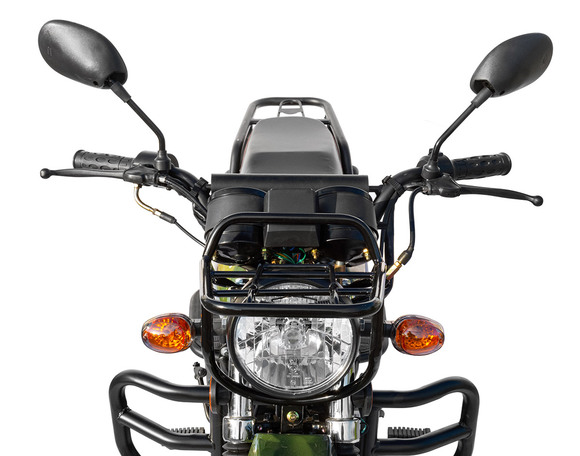 Комплектация Тормозная система – два барабанных тормоза. Усиленные тросы переднего тормоза и сцепления. Кроме того, на Regulmoto Alpha (RM-3) установлены зеркала заднего вида, подножки для пассажира, багажный кофр, пластиковые бардачки, кожух защиты цепи и дуги безопасности.
