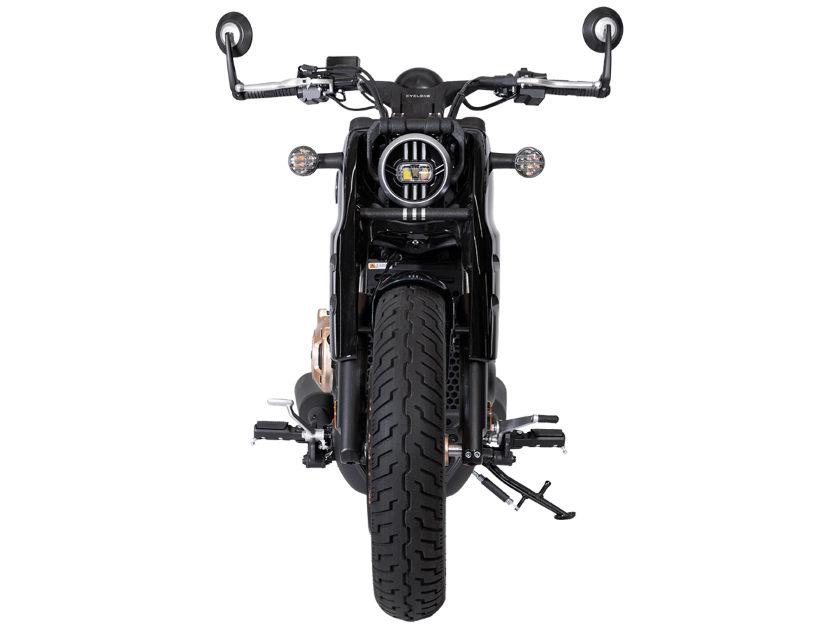 Мотоцикл CYCLONE RA600 Bobber – одноместный круизёр, готовый рассекать по городу и скоростным трассам. Лёгкая в управлении и надёжная модель с 550-кубовым двигателем, имеющая комфортный расход топлива для ежедневных поездок, хороший запас хода и оптимальную длину передач для маневрирования в потоке.Мотоцикл оснащён 2-цилиндровым 4-тактным двигателем ZS550SR жидкостного охлаждения с 4 клапанами на каждом цилиндре и 2 распредвалами. Двигатель имеет объём 550 см³ и способен обеспечить мощность в 59 л.с. при 8500 об/мин. Максимальный крутящий момент в 55 Нм достигается при 6500 об/мин. Подачу топлива обеспечивает инжектор BOSCH. Механическая коробка передач имеет 6 ступеней и схему 1-N-2-3-4-5-6.Максимальная скорость 165 км/ч.Объём топливного бака 14,5 литра.Колёса с легосплавными дисками имеют диаметр 16 дюймов. В качестве подвески используются телескопическая вилка и регулируемый маятник с моноамортизатором. Мотоцикл оснащён датчиками давления в шинах, показатели от которых выводятся на приборную панель. Клиренс в 150 мм позволяет комфортно проходить препятствия на дороге.Тормозная система произведена компанией J.JUAN, входящей в холдинг BREMBO. На оба колеса установлены гидравлические дисковые тормоза. Спереди установлен 2-поршневой суппорт, сзади используется однопоршневой суппорт с плавающей скобой. Дополнительную безопасность обеспечивают системы ABS и TCS. Они повышают устойчивость при экстренном торможении и на сложных поверхностях.Габариты модели 2190х855х1115 мм, снаряженная масса 198 кг. Высота по седлу 725 мм, колёсная база 1510 мм. Мотоцикл оснащён USB-портом для зарядки устройств