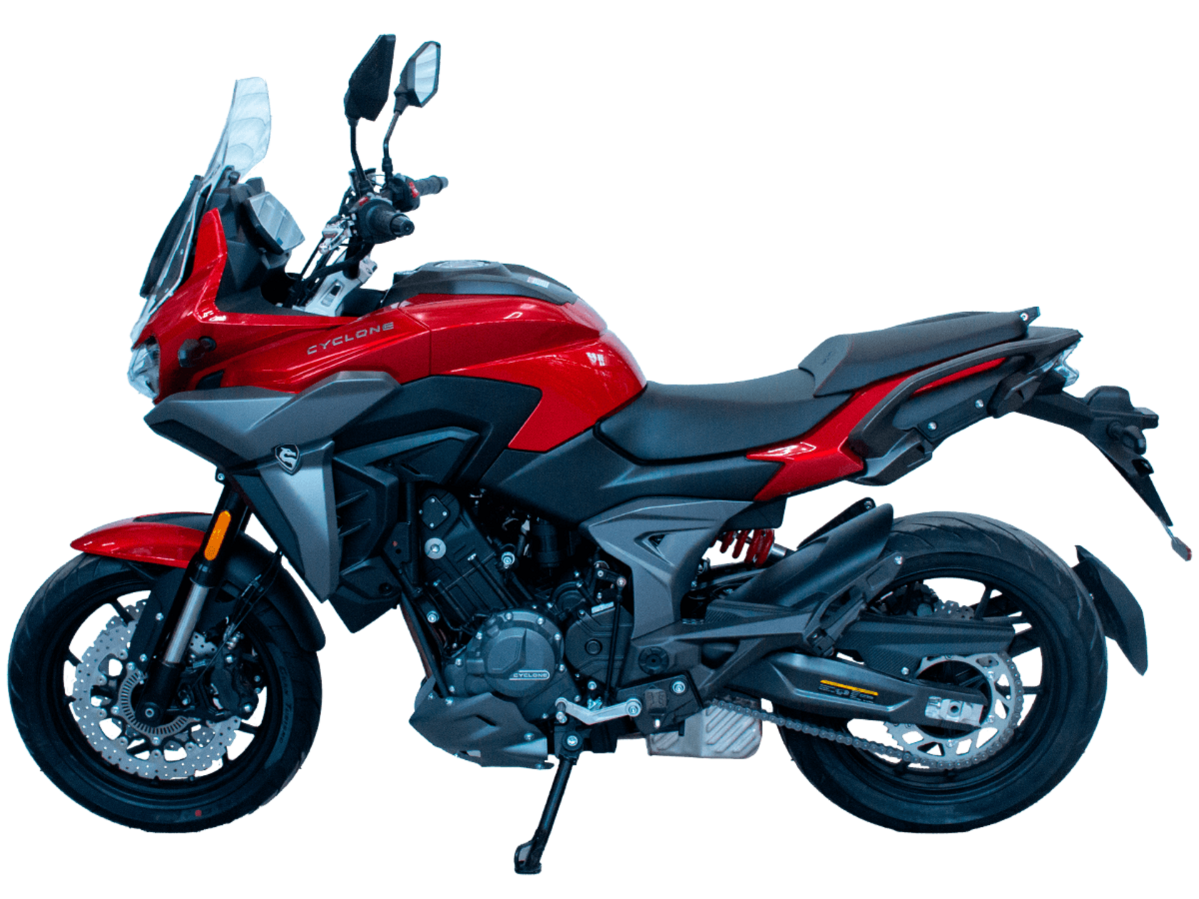CYCLONE RX6 (SR650) – туристический эндуро для покорения самых непростых и протяжённых маршрутов. Он обладает агрессивным и современным дизайном, который выгодно выделяет его из всех остальных мотоциклов в своём классе. Мотоцикл дарит своему владельцу абсолютную свободу передвижения, позволяя долго и быстро ехать по шоссе, а при желании съезжать на такие дороги, по которым не проедет ни один дорожный мотоцикл. Небольшие габариты этого байка позволяют с успехом использовать его, как повседневный дорожный мотоцикл.Данная модель является самой крупнокубатурной в модельном ряде компании CYCLONE. Рядный двухцилиндровый четырёхтактный двигатель объёмом 650 см3 выдаёт мощность в 71 л.с. на 8500 об/мин. Максимальный крутящий момент достигается на 7000 об/мин и составляет 62 Н·м. Инжекторный впрыск топлива с блоком управления BOSCH увеличивает топливную экономичность, а также позволяет добиться высокой приёмистости и неприхотливости агрегата. Жидкостная система охлаждения не допустит перегрева двигателя даже при самом агрессивном вождении. На мотоцикл установлена 6-ступенчатая механическая коробка передач.Максимальная скорость мотоцикла составляет 180 км/ч.Модель оснащена литыми алюминиевыми дисками диаметром 17 дюймов. Колёса обуты в бескамерные покрышки от легендарной фирмы PIRELLI. С неровностями дороги эффективно справляются компоненты производства культовой японской компании KYB – телескопическая вилка перевёрнутого типа спереди и маятник с моноамортизатором сзади. Ход передней подвески составляет 130 мм, задней – 51 мм. Оба компонента подвески являются регулируемыми. Эффективное и безопасное замедление с любых скоростей обеспечивают гидравлические дисковые тормоза с двухканальной системой ABS спереди и сзади. Тормозные системы произведены известной испанской фирмой J.JUAN (входящей в легендарный холдинг BREMBO).Мотоцикл отличает хорошо продуманная компоновка с высоко расположенным радиатором. Высота 820 мм по седлу позволяет чувствовать себя комфортно даже райдерам небольшого роста. На данной модели установлена металлическая защита выхлопной системы и масляного фильтра. Под пассажирским сиденьем размещён небольшой, но крайне полезный набор инструментов.RX6 (SR650) оснащён бортовым компьютером с информативным цветным дисплеем и кнопками управления на руле, а также двумя штатными видеорегистраторами спереди и сзади. Из других приятных мелочей в допоборудовании мотоцикла стоит выделить регулируемое при помощи кнопки ветровое стекло, датчики давления в шинах, подсветку пультов, бесключевой доступ и 2 USB-порта.Клиренс мотоцикла составляет 165 мм. Объём топливного бака – 20 л. Снаряжённая масса – 245 кг.Мотоцикл сочетает в себе отличные технические характеристики, богатое оснащение, комфорт и надёжность, что позволяет вам ощутить настоящую свободу, отправившись на нём в любое путешествие.