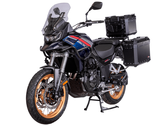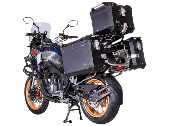 Мотоцикл CYCLONE RX600 ADV 2025 ПТС – туристический эндуро для покорения самых непростых и протяжённых маршрутов.Силовая установка представлена 2-цилиндровым 4-тактным двигателем DOHC объёмом 550 см³ с 4 клапанами на каждом цилиндре. Мощность в 59,9 л.с. достигается при 8500 об/мин, а максимальный крутящий момент 55 Н·м при 6500 об/мин. Соотношение диаметра цилиндра и хода поршня 72х67,6 мм. Степень сжатия 11:1. Жидкостная система охлаждения не допустит перегрева двигателя даже на самых непростых маршрутах. Механическая коробка передач имеет 6 ступеней.Максимальная скорость 170 км/ч.Объём топливного бака 18 литров.На мотоцикл установлены спицованные алюминиевые колёса диаметром 19 дюймов спереди и 17 дюймов сзади. В качестве передней подвески используется телескопическая вилка перевёрнутого типа с ходом 130 мм, а задней – маятник с моноамортизатором с ходом 55 мм. Оба компонента подвески регулируются. На переднее колесо установлены 2 тормозных диска диаметром 305 мм с 4-поршневыми суппортами, а сзади используется тормозной диск 258 мм с однопоршневым суппортом с плавающей скобой. Дополнительно на оба колеса установлена настраиваемая ABS-система.Габариты мотоцикла 2160х870х1399 мм, вес 219 кг. Клиренс 175 мм, колёсная база 1410 мм, высота по седлу 810 мм.Оснащён противобуксовочной системой и датчиками давления в шинах. Для освещения используется диодная светотехника. Многофункциональная приборная панель имеет TFT-дисплей. На руле установлена подсветка пультов. Для зарядки устройств имеется USB-порт. Также есть защитные дуги, защита двигателя, 3 кофра и центральная подставка.