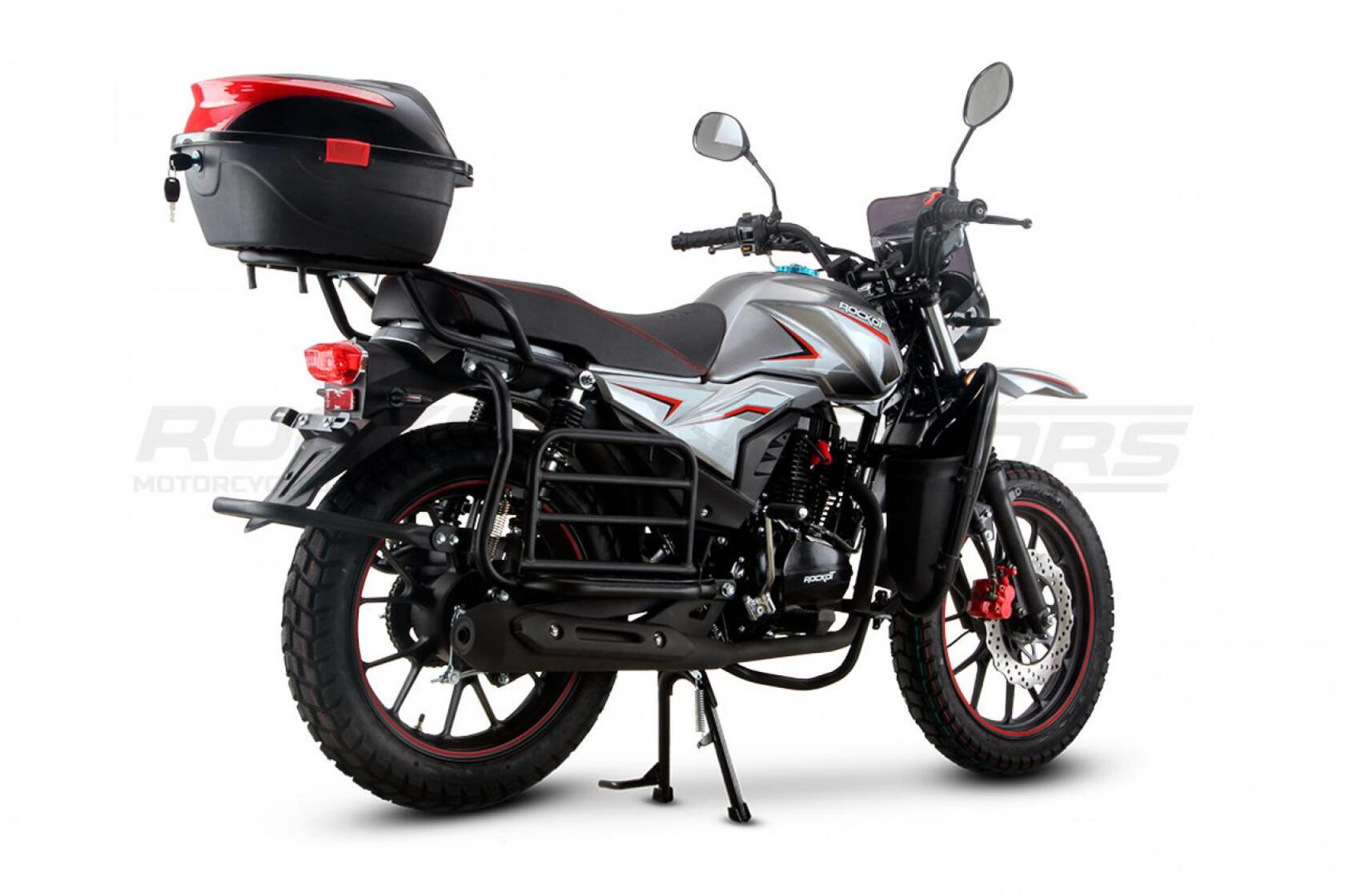 ROCKOT QUEST 150 - новый, дорожный мотоцикл от компании ROCKOT-MOTORS, с большим потенциалом на длительные поездки, независимо от типа дорожного покрытия. Благодаря своим компактным размерам, короткой колесной базе, мотоцикл отлично чувствует себя в городской среде с большим объемом дорожного трафика. Максимальная скорость ROCKOT QUEST 150 - до 92 км/ч на стандартных приводных звездах. Масса мотоцикла -126 килограмм, но при небольшой высоте по седлу в 820 мм и низкому центру тяжести, он ощущается достаточно легким.Мотоцикл имеет ЭПТС, оснащен цветной электронной панелью приборов, зеркалами, всей необходимой светотехникой, что позволяет законно передвигаться по дорогам общего пользования. ДизайнМотоцикл построен в классическом исполнении, но имеет множество современных, технологичных решений.Все световые приборы - светодиодные и очень яркие. Передняя фара имеет круглую классическую форму, но стоит ее включить, как мотоцикл обретает совершенно другой вид.Цветовая гамма модели имеет три варианта окраски: бело-красный, черный и серый.Конечно же, бросается в глаза оснащение мотоцикла туристической багажной системой. На заднем багажнике установлен жесткий центральный кофр. Откидные боковые багажники, позволяют перевозить объемный груз, а также устанавливать боковые багажные сумки. Глядя на мотоцикл, складывается впечатление, что все его пространство использовано максимально практично. Даже в дугах безопасности встроены дополнительные багажные карманы.Топливная системаВ основе топливной системы ROCKOT QUEST 150 - большой топливный бак объемом 12 литров. В зависимости от условий эксплуатации и стиля езды, расход топлива варьируется в районе 3-3,5 литров на 100 километров. Это позволяет преодолевать большие расстояния на одном баке бензина. Используемый тип топлива - бензин АИ-92. Образует топливную смесь - карбюратор PZ27 с ускорительным насосом. Ускорительный насос исключает момент “провала” при резком открытии дроссельной заслонки.Тормозная системаПо канонам классического мотоциклостроения, ROCKOT QUEST 150 имеет комбинированную тормозную систему. Спереди установлен дисковый гидравлический тормоз, с двухпоршневым суппортом, яркого красного цвета. Задний тормоз - механический, барабанный.Кому подойдет ROCKOT QUEST 150Мотоцикл будет очень полезен новичкам. Его небольшие габаритные размеры, низкий центр тяжести, малая высота по седлу - позволяют быстро освоить технику управления мотоциклом как в условиях города, так и бездорожья. С практичной точки зрения, мотоцикл понравится любителям выезжать на отдых за город. Отличная туристическая подготовка, позволит перевозить все, что Вам может потребоваться во время отдыха.Благодаря заложенной надежности в конструкцию двигателя и мотоцикла - ROCKOT QUEST 150 оценит старшее поколение, для кого требуется простая и надежная техника.
