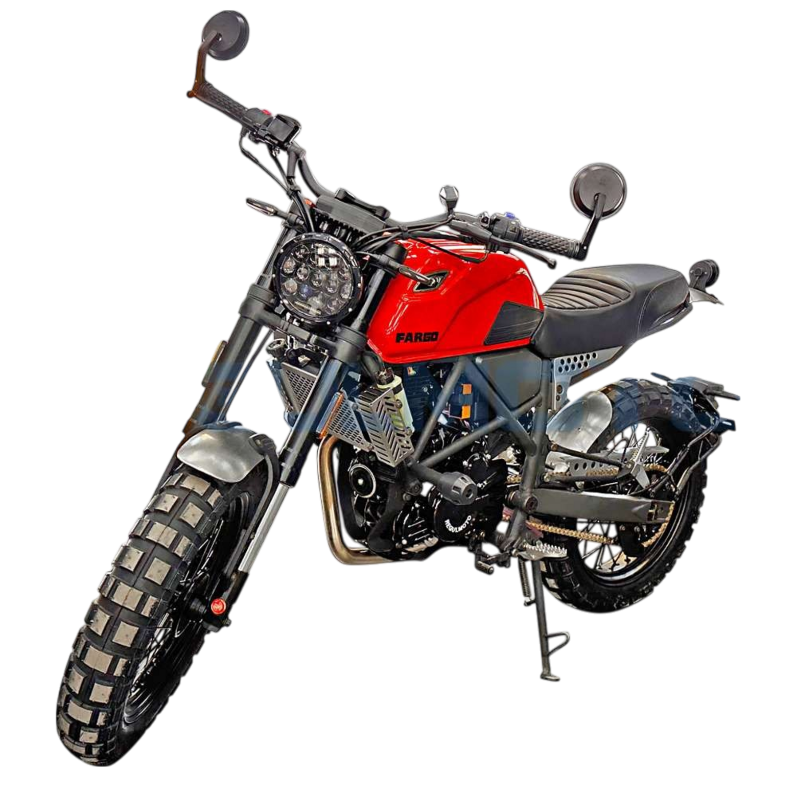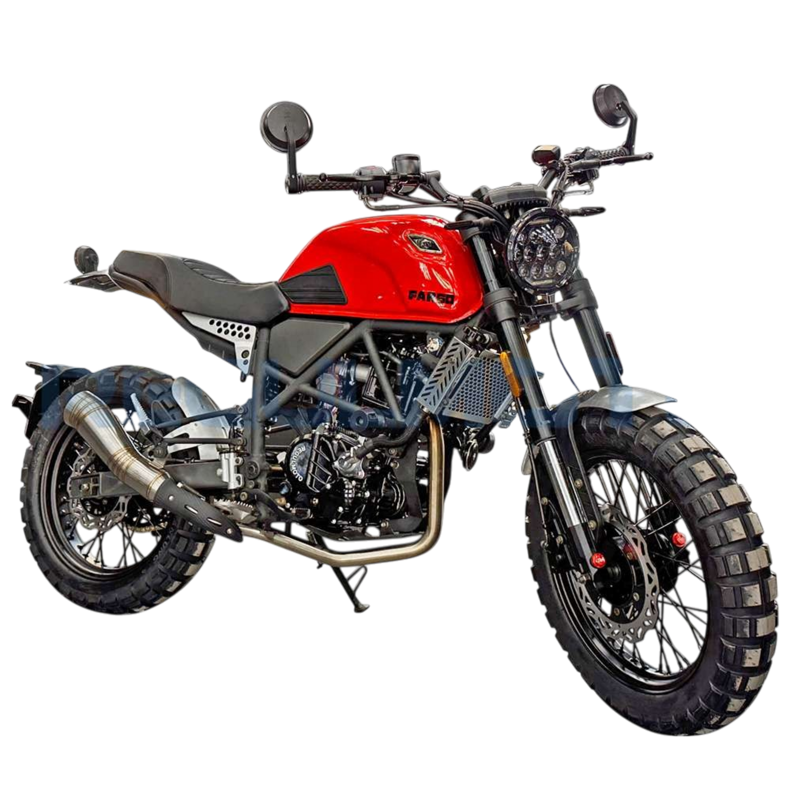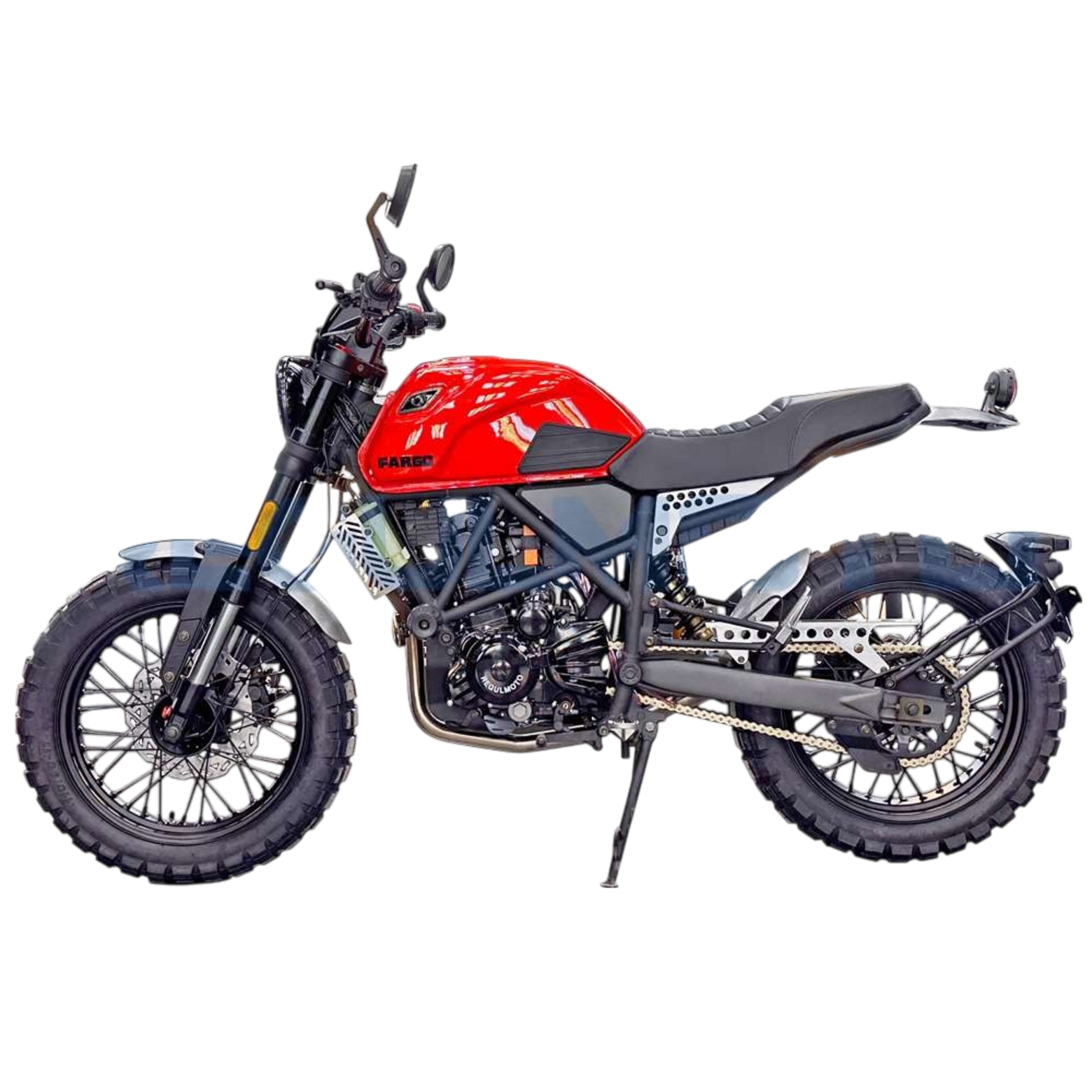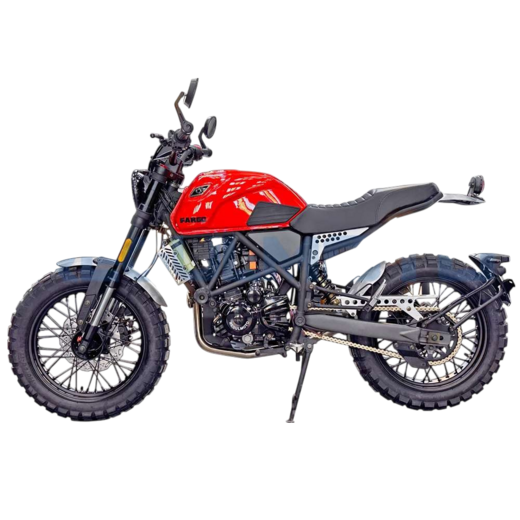 Regulmoto Fargo 300 новинка 2024 года!УправлениеУдобная прямая посадка позволяет как неспешно передвигаться, любуясь пейзажами, так и маневрировать на бездорожье или в городском потоке. Байк отличается послушностью, а тормоза обеспечивают замедление с любой скорости.Колеса и подвескаПередняя перевернутая вилка мягкая и плавная. Это позволяет преодолевать с комфортом даже самые «убитые» дороги. Задний моноамортизатор обеспечивает стабильность на бездорожье и в труднопроходимых местах.Колеса на Fargo 300 имеют эффектный внешний вид. Широкие шины с выраженным шипом обеспечивают отличное сцепление с любой поверхностью, а спицованные диски защищают байк от загрязнения и выхода из строя.ДвигательВ версии Regulmoto Fargo 300 используется двигатель от известного производителя Zongshen 174MM (CBS300) с водяным охлаждением и карбюратором Nibbi Racing PWK 34. Объединяя инновационные технологии и высокую производительность, он обеспечивает отличную динамику, экономичность и долговечность, делая каждую поездку ещё более впечатляющей.РамаРама Regulmoto Fargo 300 имеет классическую компоновку. Сварная штампованно-трубчатая конструкция имеет выверенный баланс между весом и жесткостью, что позволяет раме выдерживать высокие нагрузки и оставаться легкой.КППКороткие передачи 6-ступенчатой КПП хорошо зарекомендовали себя на бездорожье. Вместе с эластичным мотором они позволяют ровно двигаться без выкручивания газа до упора, а жидкостный радиатор охлаждения защищает мотор от перегрева.Regulmoto Fargo 300 — редкий случай, когда в одном мотоцикле идеально сочетается стиль и функциональность. Это настоящий скремблер — мотоцикл, построенный на базе лёгкого городского байка, приспособленного к передвижению вне дорог за счёт установки более длинноходных подвесок и внедорожных шин.При этом мотоцикл отлично вписывается в городской пейзаж, с лёгкостью преодолевает пробки, а за его пределами позволяет срезать путь, прохватив по грунтовкам.