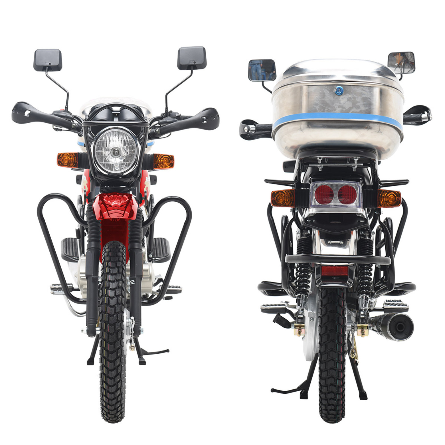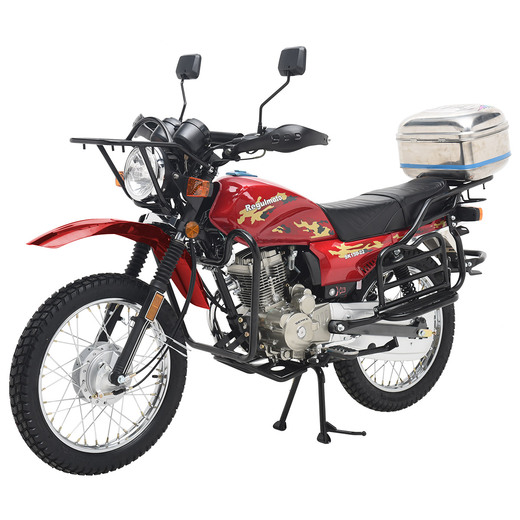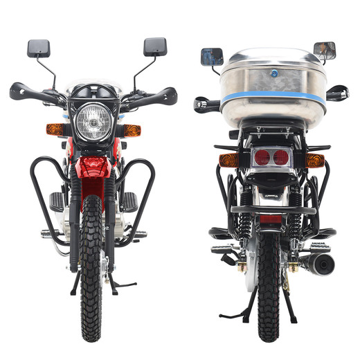 Комплектация Тормоза барабанные, цепь 428Н, защита рук, клетка, кофр, зеркала заднего вида, центральная и боковая подножки.