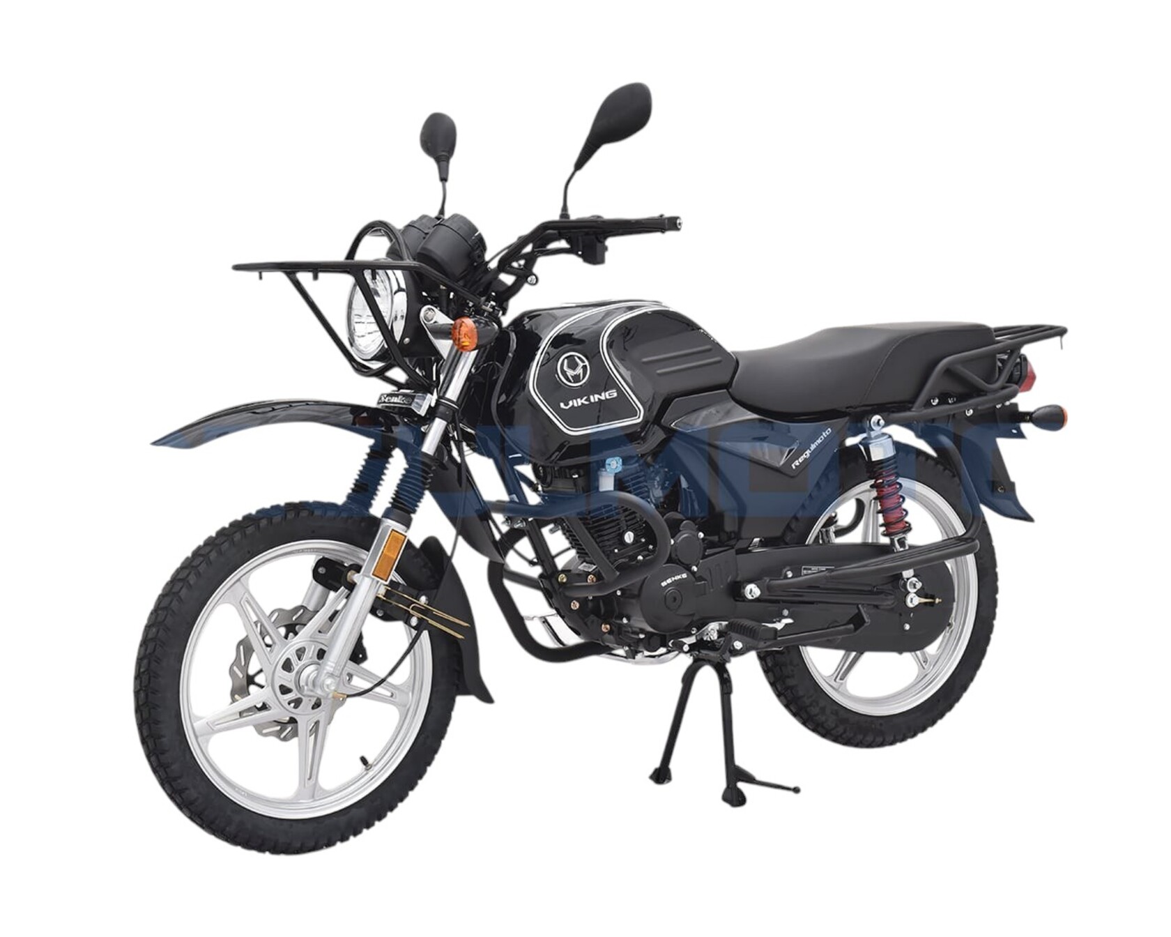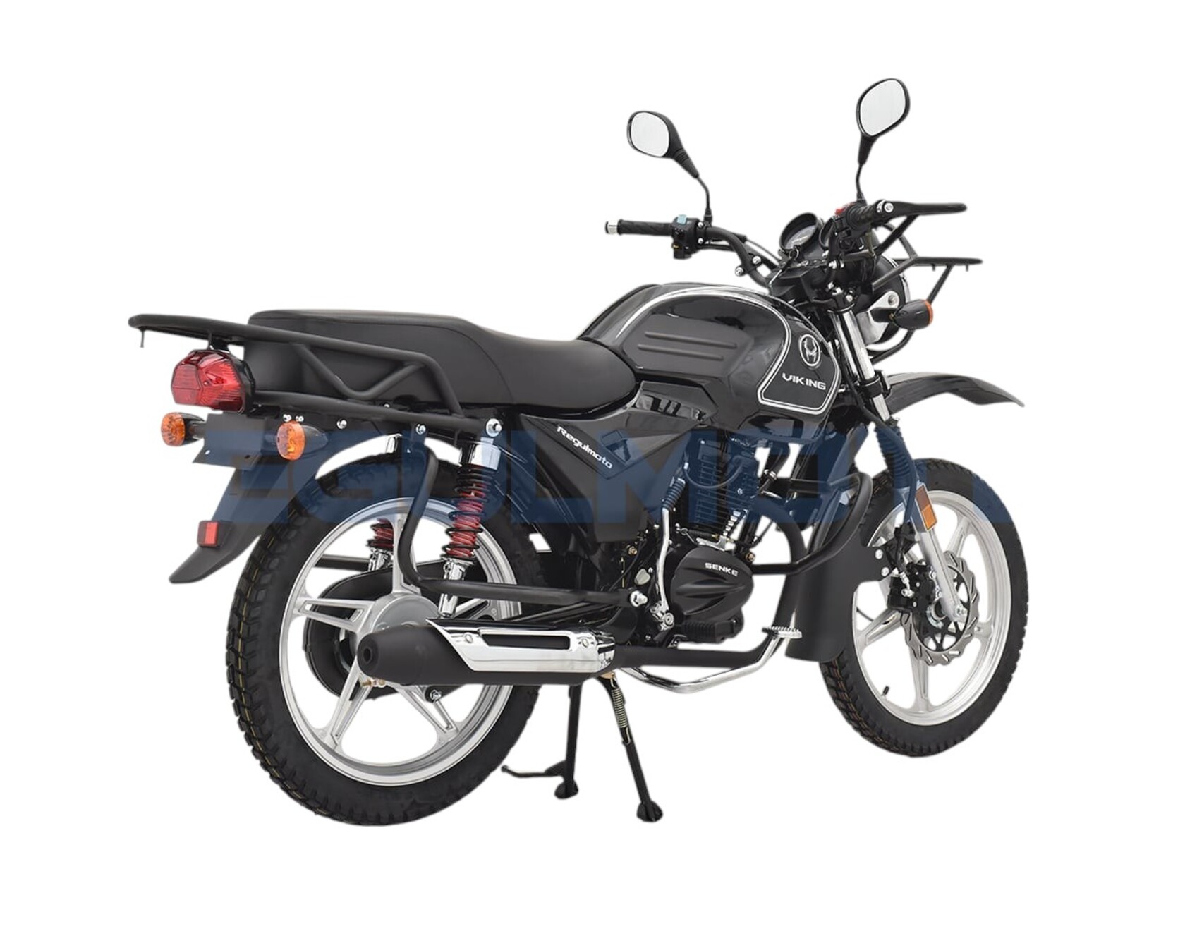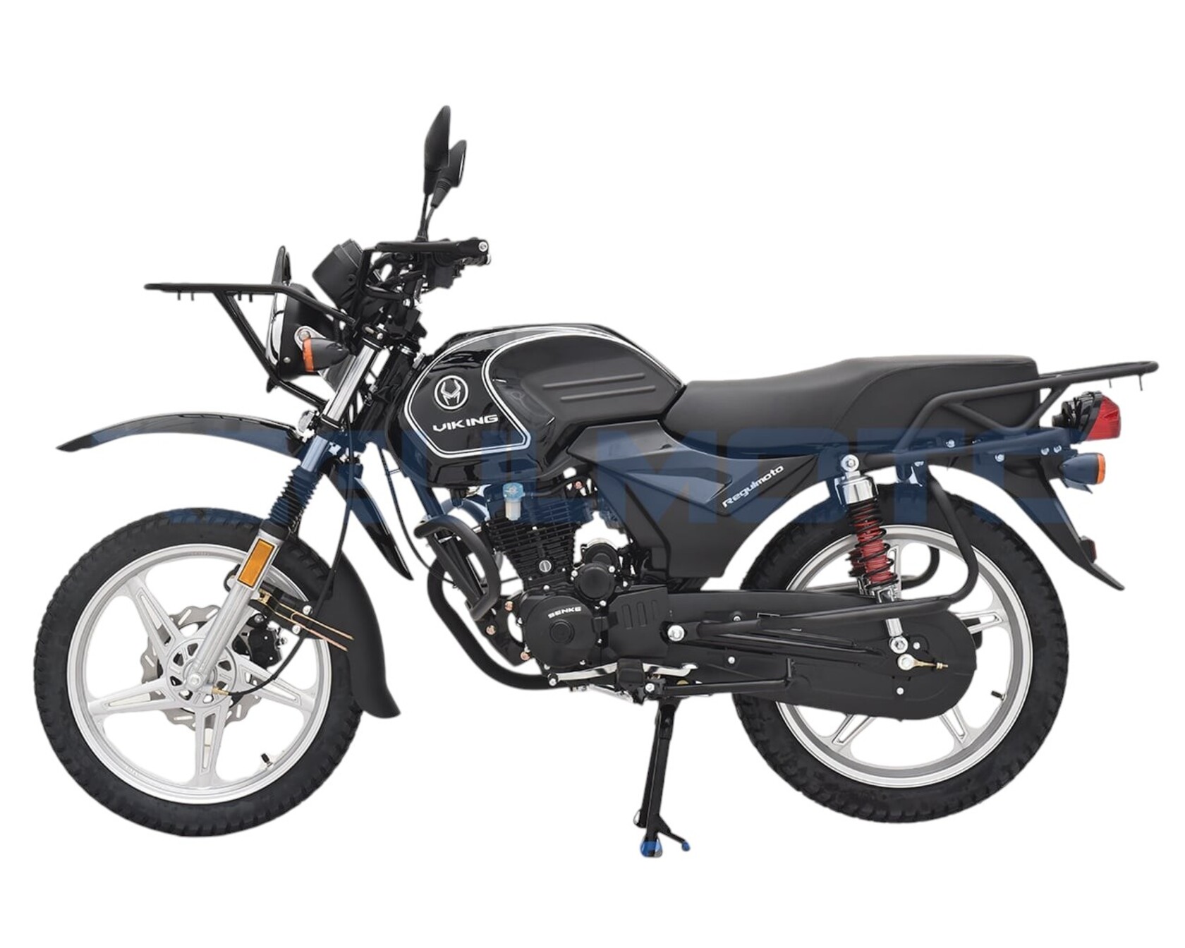 Компания «Regulmoto» представляет вниманию поклонников двухколесной мототехники мотоцикл Regulmoto VIKING – надежный и доступный для многих байк с широкими эксплуатационными возможностями. Мотоцикл Regulmoto VIKING – один из ярких представителей линейки малокубатурной мототехники известного азиатского производителя Senke. Мотоциклы производства одного из крупнейших китайских концернов пользуются заслуженным признанием экспертов и мотолюбителей в различных частях света, включая Европу и Америку. Продукцию Senke отличают не только одно из лучших на рынке соотношений достойного качества и демократичной цены, но и солидный эксплуатационный ресурс, высокая надежность, простое и недорогое сервисное обслуживание.В раме мотоцикла с 18-дюймовыми колесами на литых дисках установлен 4-тактный 150-«кубовый» двигатель с воздушным охлаждением, который способен развивать максимальную мощность в 11,6 лошадиных сил. Наличие у двигателя балансирного вала способствует снижению вибрации при работе мотора. 5-ступенчатая трансмиссия, электростартер, полноценная подвеска, представленная телескопической вилкой спереди и двумя амортизаторами и маятником сзади, приборная панель и емкий топливный бак – все это позволит получать максимум удовольствия от поездки. За безопасность использования мотоцикла отвечают надежная тормозная система (дисковый тормоз спереди и барабанный сзади), комплект светового оборудования и зеркал заднего вида.