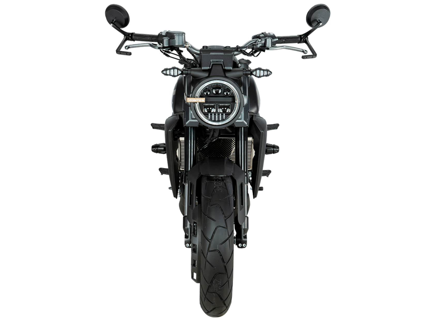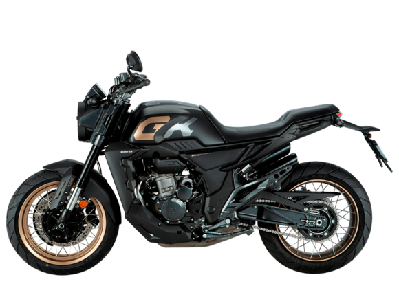 Мотоцикл ZONTES ZT350-GK – современный неоклассик для покорения городских пространств. Хорошо проявляет себя как в тесном межрядье, так и на свободных трассах.Силовая установка представлена одноцилиндровым 4-тактным двигателем ZT184MP с 4 клапанами и 2 верхними распредвалами. Двигатель имеет объём 348 см³ и обеспечивает мощность в 39 л.с. Оснащён инжектором BOSCH и системой жидкостного охлаждения. Механическая коробка передач имеет 6 ступеней и схему 1-N-2-3-4-5-6. Запуск двигателя осуществляется с помощью бесключевого доступа.Ёмкость топливного бака 17 литров.Бескамерные спицованные колёса имеют диаметр 17 дюймов. На мотоцикл установлены датчики давления в шинах, показатели от которых выводятся на приборную панель. Для подвески спереди используется телескопическая вилка, сзади – моноамортизатор. Гидравлические дисковые тормоза произведены испанской компанией J.JUAN, входящей в холдинг BREMBO. Передний тормозной диск скрыт под защитным кожухом.В конструкции мотоцикла используется трубчатая стальная рама. Рычаги тормоза и сцепления, а также лапки КПП можно отрегулировать. Рычаги снабжены защитными скобами. Для освещения используется яркая LED-оптика, а приборная панель представлена цифровым дисплеем. Имеется 2 USB-порта.Габариты мотоцикла 2070х845х1120 мм. Колёсная база 1390 мм. Высота по седлу 795 мм. Вес 169 кг.