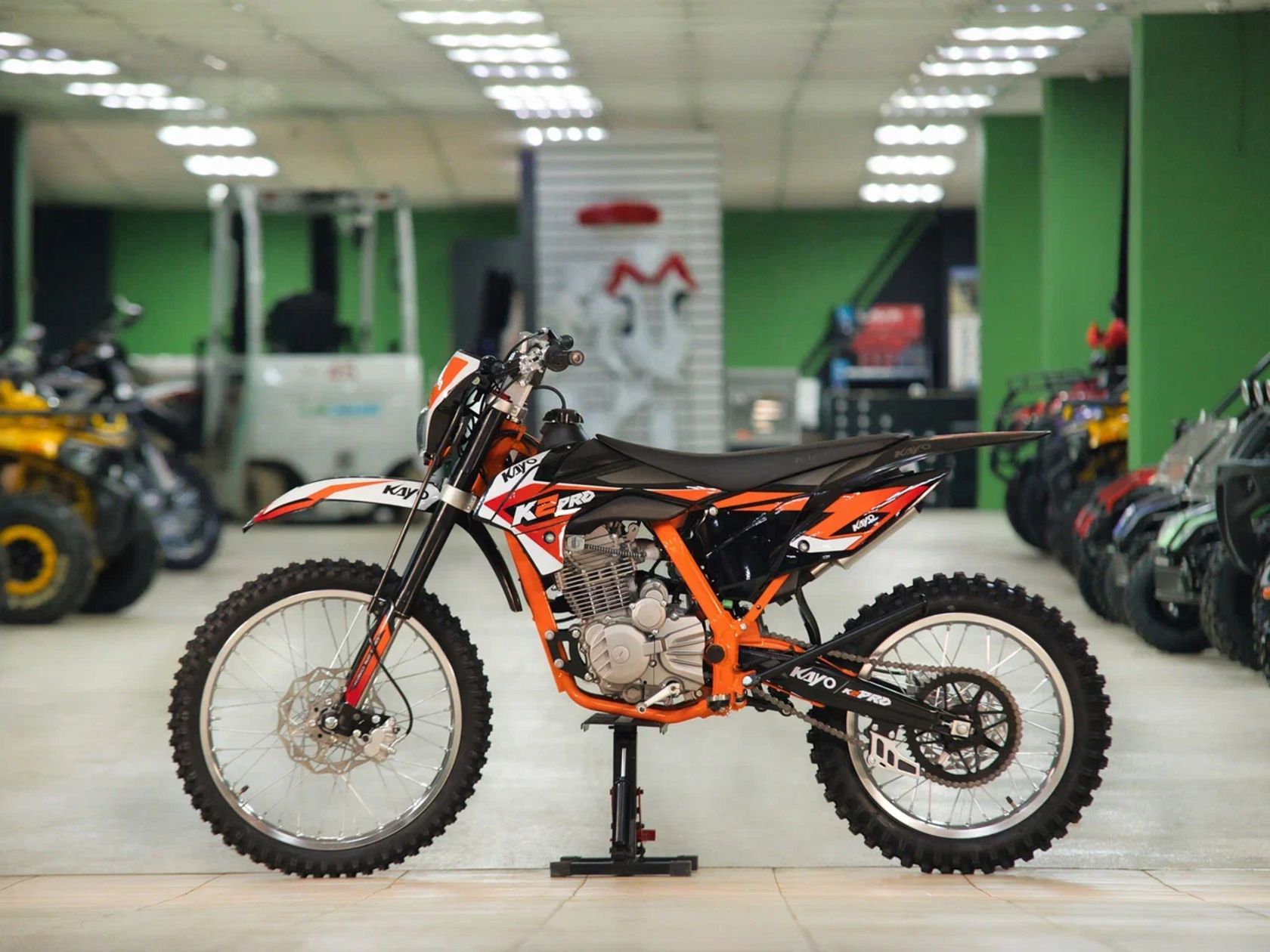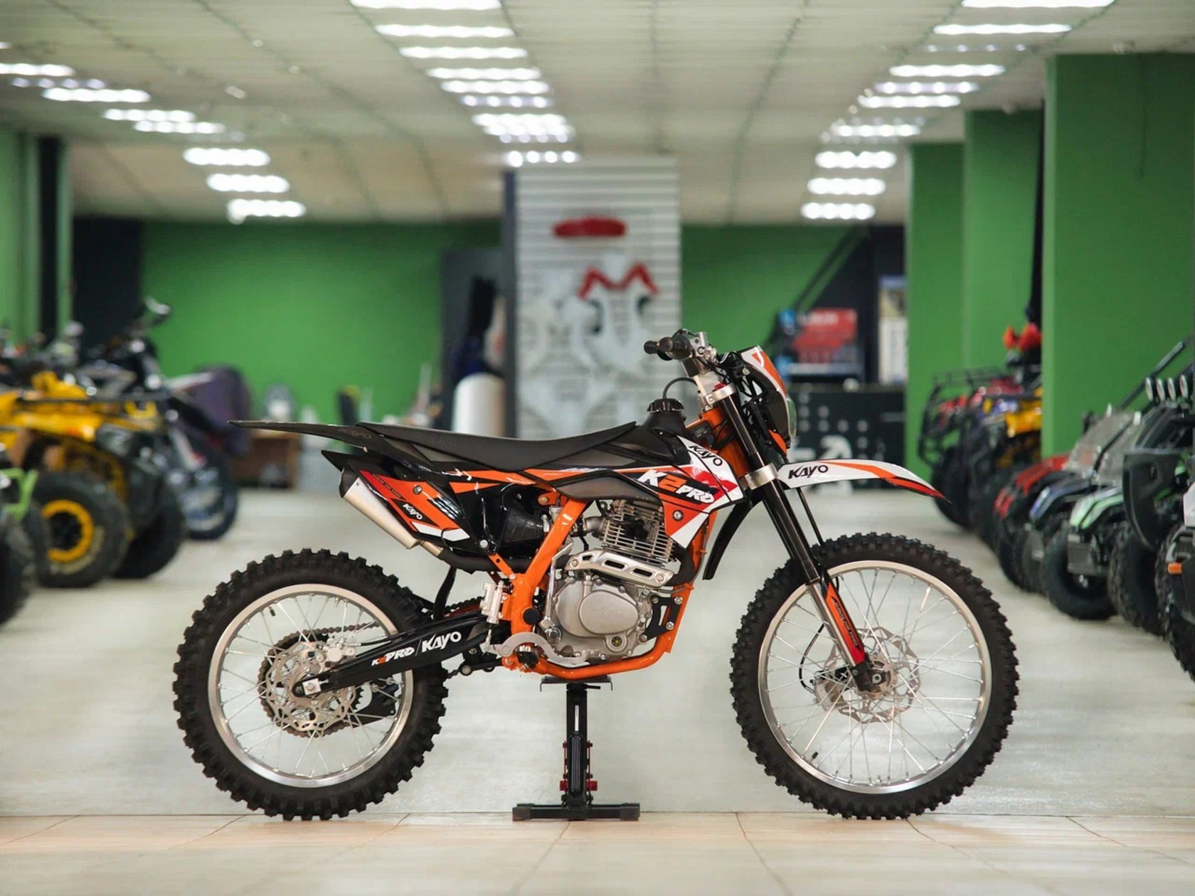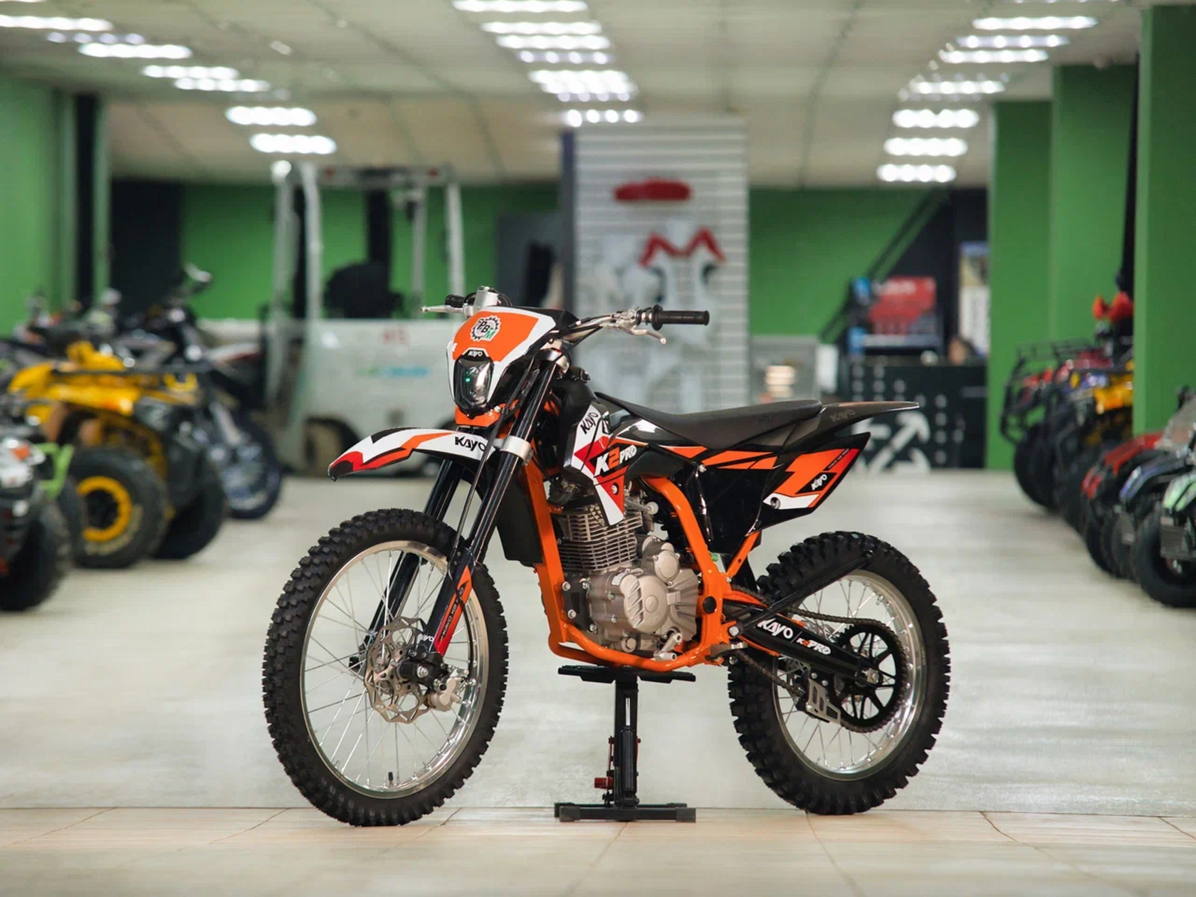 Кроссовый мотоцикл KAYO K2 Pro – идеальный снаряд для внедорожного экстрима, представляющий собой оптимальный баланс производительности и технической оснащённости, поэтому он идеально подходит как новичкам, так и опытным райдерам. Он является улучшенной версией “народного” мотоцикла KAYO K1. Удобный, простой и надёжный мотоцикл, который полностью оправдывает свою цену.Мотоцикл оснащён одноцилиндровым 4-тактным двигателем воздушного охлаждения (ZONGSHEN CB300/ZS175FMM) объёмом 271 см3, который обеспечивает высокую мощность (24 л.с.) и крутящий момент, что позволяет развивать большую скорость и с лёгкостью преодолевать трассы со сложным рельефом. Карбюратор NIBBI PE30 обеспечивает бесперебойную работу техники в самых жестких условиях эксплуатации, простоту и лёгкость в обслуживании, а также неприхотливость к качеству топлива. Аппарат оснащён 5-ступенчатой механической коробкой передач с классической схемой “1-N-2-3-4-5”.Усиленная рама из хром-молибденового сплава и подвеска позволяют эффективно амортизировать удары при езде по неровностям и препятствиям на трассе. Передняя подвеска — регулируемая телескопическая вилка перевёрнутого типа от фирмы KKE длиной 800 мм, задняя — регулируемый моноамортизатор 420 мм с прогрессией, рассчитанный на высокие нагрузки, также произведённый компанией KKE. Мотоцикл оснащён классическими спицованными колёсами диаметром 18 и 21 дюйм. Эффективное и безопасное замедление с любых скоростей обеспечивают гидравлические дисковые тормоза.Мотоцикл достаточно компактен, поэтому он комфортен в эксплуатации одновременно и для мужчин среднего телосложения, и для девушек. Байк оснащён системой запуска двигателя при помощи кнопки электростартера или при помощи рычага кик-стартера.Высококачественная износостойкая резина с развитым протектором отлично держит дорогу на различных типах покрытия и в самых разных поворотах. Сиденье эргономичной формы покрыто антискользящим материалом.K2 Pro сочетает в себе отличные технические характеристики, комфорт и надёжность, что позволяет вам ощутить настоящую свободу на любой трассе.