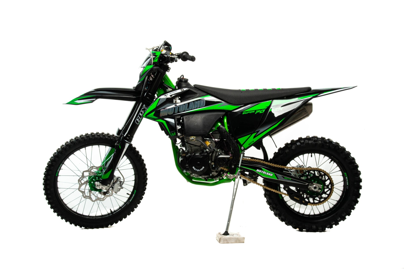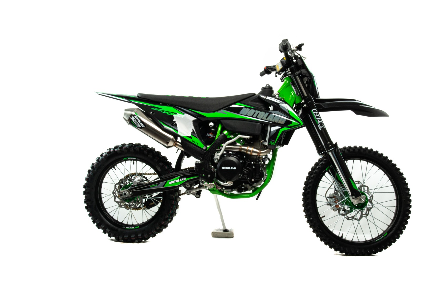 Мотоцикл Motoland FX 450 NC- новинка 2022 г.Современный дизайн мотоцикла подчёркивает спортивный характер байка.Установлен мощный двигатель с водяным охлаждением ZONGSHEN 194 MQБольшой ход подвесок для комфортного передвижения по пересеченной местности, которые также позволяют ехать быстро и агрессивноМотоцикл больше предназначен для езды по переченной местности полям и лесам, чем для города из за профиля резины.Он маневренный и удобный,сидение с противоскользящим чехлом.При этом он прост в управлении и неприхотлив в обслуживании и подходит мотолюбителям любого возраста и опыта вождения.Технические характеристикиАнтибуксаторы спереди и сзади для езды на пониженном давлении или защиты от прокручивания камерыВыхлопная труба с Power Bomb и креплениями под пружины и прямоточным глушителем, в котором установлена флейтаПередняя вилка перевернутого типа с регулировкой. Задний амортизатор с регулировкой.Быстрый доступ к воздушному фильтру для комфортного обслуживанияОбновленная тормозная система. Передний суппорт 2х поршневой, задний 1 поршневой.Алюминиевый маятник + подрамникГерметичная проводкаРычаги - "неломайки"Полые осиАлюминиевые звездыУвеличенный диаметр спиц - 5ммУстановлена цепь 520HSУстановлены запчасти NIBBIВысота по седлу 970мм.Вес 125 кг.