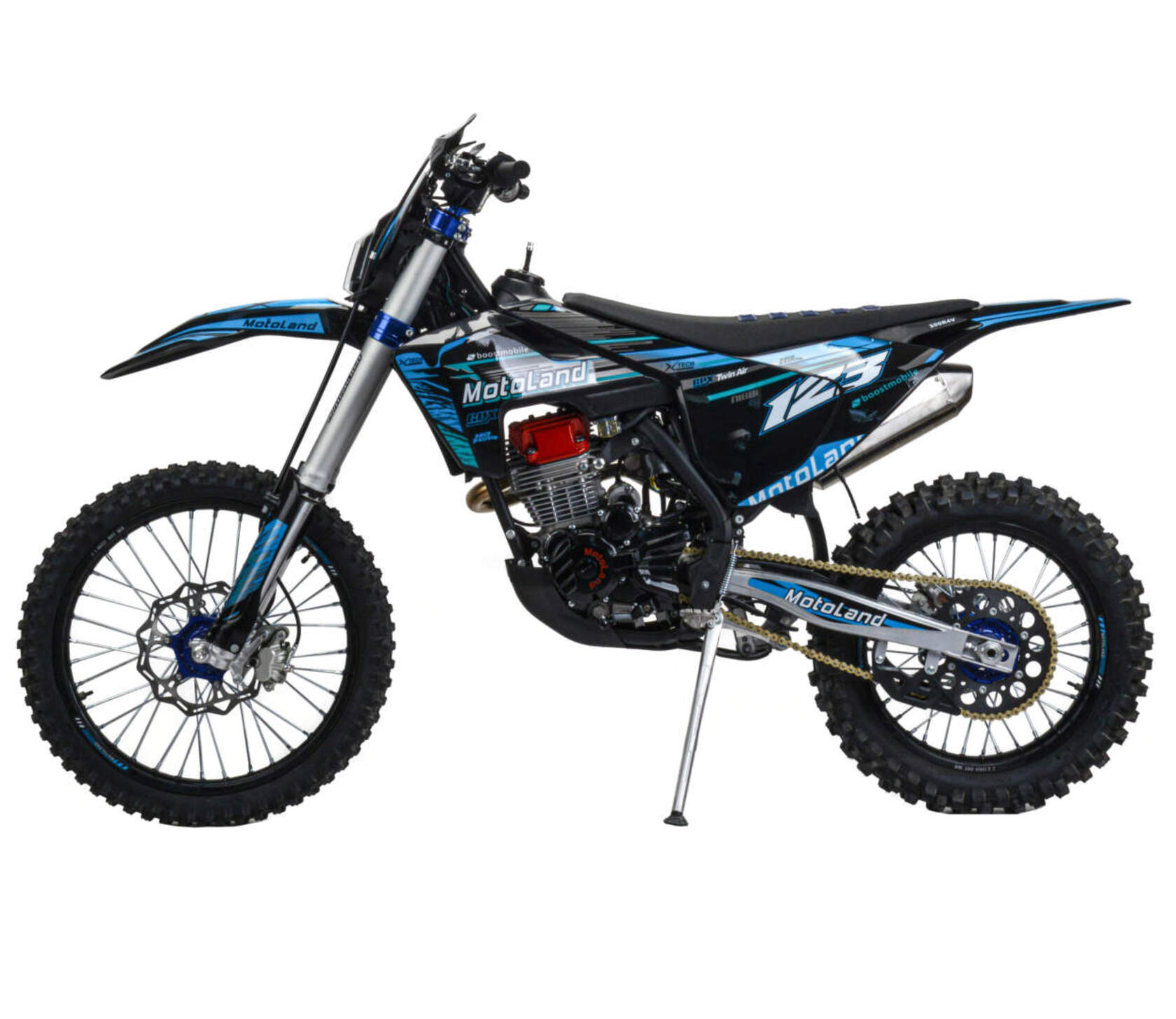 Мотоцикл Motoland XT300 STНадёжная техника оснащенная двигателем 175FMM (PR5 4 клапана) с водяным охлаждением. с кикстартером и электростартером, Мощностью 26 Л.С. на двигателе установлен Карбюратор NIBBI n34 с ускорительным насосом.Это полноразмерный кроссовый мотоцикл его база по осям составляет 1400 мм., и габаритами 2100х800х1120 мм. Высота по седлу составляет 950 мм. Передние и задний амортизаторы с регулировками.За счет сбалансированной базы мотоцикл имеет отличную управляемость, а конструкция рамы и особенности настройки подвески GPX способствуют максимальному поглощению неровностей дорожного покрытия, а так же усиленная прогрессия на игольчатых подшипниках. Алюминиевые обода c антибуксаторами, усиленными спицами и ступицами.На кроссовой резине 80/100-21 / 110/100-18На мотоцикле установлена обновлённая тормозная система обеспечивающая отличные тормозные характеристики. Глушитель с уникальным дизайном прямоточного типа, полностью алюминиевый для облегчения веса.