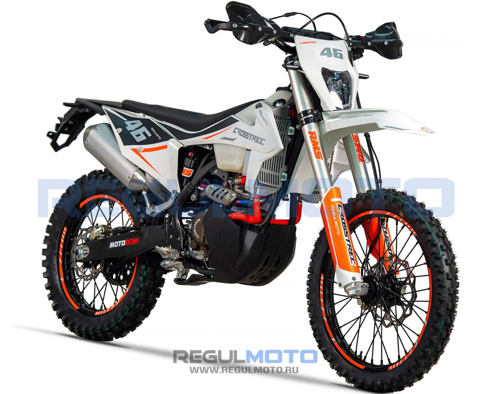Мотоцикл Regulmoto Crosstrec 300 - новый в ряду мототехники Regulmoto, представляющий класс «dualsport», востребованный у отечественных поклонников двухколесного транспорта. Данный эндуро-байк отличают достаточно мощный форсированный двигатель и широкие возможности использования, благодаря наличию у мотоцикла паспорта транспортного средства и установленного в стоке оборудования, необходимого для передвижения по дорогам общего пользования.Рама этого мотоцикла многоцелевого назначения изготавливается из высокопрочного хромомолибденового стального сплава, ее конструктив является точной репликой изделия известного австрийского мотобренда; элементы обвеса также идентичны пластику именитого родителя.В мощной раме стоит модернизированная версия популярного одноцилиндрового мотоциклетного мотора 174MN-5 (NB300) производства компании Zongshen. Форсированный двигатель с 5-ступенчатой коробкой передач отличают выросший порог максимальной мощности, больший крутящий момент в диапазоне низких оборотов и более производительная система охлаждения. В тракте подготовки топливной смеси работает карбюратор PWK34 производства компании Nibbi Racing.