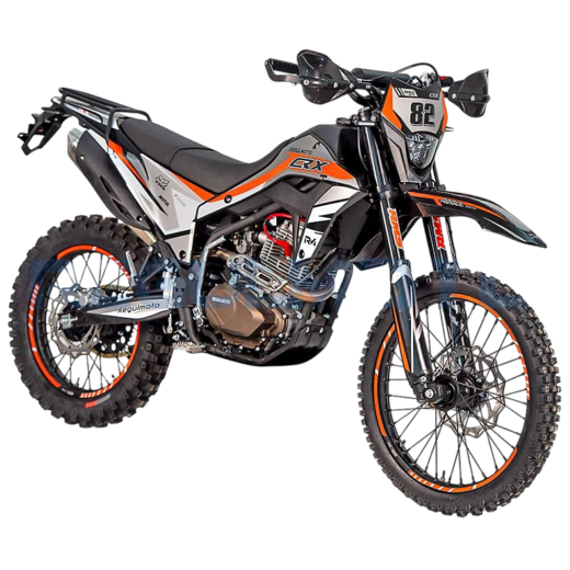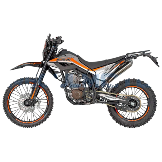Regulmoto SK 250GY-5 – мотоцикл двойного назначения, созданный для эксплуатации как на дорогах общего пользования, так и на легком бездорожье. Топовая модель линейки лайт-эндуро мототехники известного китайского производителя Senke отличается высокой надежностью повседневной эксплуатации, отсутствием сложностей в сервисном обслуживании, простотой и легкостью управления.В надежной раме с защитными дугами Regulmoto SK 250GY-5 установлен 4-тактный одноцилиндровый двигатель с рабочим объемов в 250 см3, демонстрирующий максимальную мощность в 18 л.с. при 7000 оборотах в минуту и максимальный крутящий момент в 16,5 Hm при 5500 оборотах в минуту. Мотор с воздушным охлаждением, в котором можно без труда признать реплику двигателя известного японского производителя, оснащается балансировочным валом, что позволяет избавиться от излишней вибрации.Подвеска мотоцикла на колесах 21/18 дюймов со стальными ободьями представлена телескопической вилкой-перевертышем спереди, перья которой закрыты защитой, и стальным маятником с моноамортизатором сзади. Тормоза у мотоцикла дисковые, спереди установлен 4-поршневой суппорт, сзади – 2-поршневой.Оснащение Regulmoto SK 250GY-5 соответствует возлагаемым на мотоцикл эксплуатационным задачам: на байке вполне комфортно передвигаться по дорогам и легкому бездорожью, чему способствуют достаточно большой ход амортизаторов, защита цепи, пластиковая защита рук. Среди установленного оборудования присутствуют: аналоговая приборная панель, замок зажигания с защитой от попадания песка и пыли, полный комплект светового оборудования с дополнительными светодиодными поворотниками, встроенными в боковые обтекатели, зеркала заднего вида, стояночная и центральная подножки.Данная модель мотоцикла присутствует на отечественном рынке мототехники уже достаточно длительное время, за которое мотоцикл зарекомендовал себя легким в эксплуатации и неприхотливым в обслуживании аппаратом. О высокой надежности мотоцикла говорят солидный километраж пробегов при отсутствии серьезных неисправностей и позитивные отзывы обладателей Regulmoto SK 250GY-5.