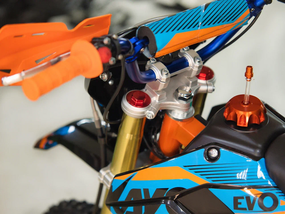 Питбайк KAYO Evolution K125EM KRZ – идеальный снаряд для наработки первого опыта в мотокроссе и эндуро, который можно использовать на лёгких кроссовых трассах и дорогах с различным покрытием. Удобный, простой и надёжный мотоцикл, который полностью оправдывает свою цену.Одноцилиндровый 4-тактный двигатель воздушного охлаждения объёмом 125 см3, выдаёт 9 л.с. Карбюратор NIBBI PE19 обеспечивает бесперебойную работу техники в самых жёстких условиях эксплуатации, простоту и лёгкость в обслуживании, а также неприхотливость к качеству топлива. Питбайк оснащён механической 4-ступенчатой коробкой передач с формулой “N-1-2-3-4”.Мотоцикл имеет вес всего 78 кг. Усиленная рама из хром-молибденового сплава и подвеска позволяют эффективно амортизировать удары при езде по неровностям и препятствиям на трассе. Передняя подвеска — телескопическая вилка перевёрнутого типа длиной 770 мм, задняя — моноамортизатор длиной 360 мм. Оба компонента подвески являются нерегулируемыми. Рама и пластик являются собственной разработкой производителя. Мотоцикл оснащён классическими стальными спицованными колёсами диаметром 17 дюймов спереди и 14 дюймов сзади. Эффективное и безопасное замедление с любых скоростей обеспечивают гидравлические дисковые тормоза с лепестковыми дисками.Высококачественная износостойкая резина с развитым протектором отлично держит дорогу на различных типах покрытия. Байк оснащён как системой запуска двигателя при помощи кнопки электростартера, так и рычагом кик-стартера. Питбайк имеет вместительный топливный бак на 5,7 л, что гораздо больше, нежели у других байков этого класса.Питбайк оснащён защитой кистей рук, стальной защитой картера и яркой линзованной фарой. Он имеет агрессивный дизайн с яркой и контрастной графикой. Если вы ищете послушный, компактный, шустрый и красивый питбайк, считайте, что вы его нашли. Это один из лучших мотоциклов для обучения и первых шагов в эндуро и мотокроссе. Он отлично подойдёт как для гонок на трассе, так и для покатушек по пересечённой местности.