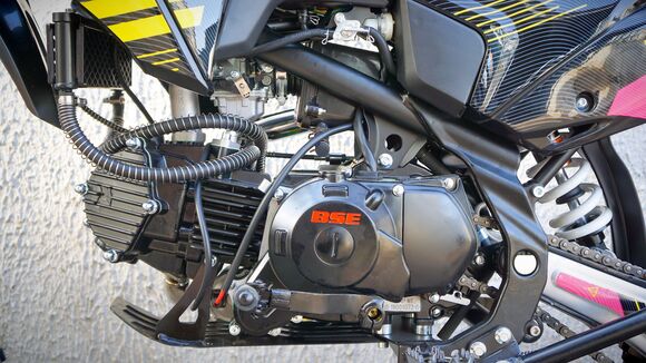 Питбайк BSE PH 150 19/16 AK47 Red (015). Основа PH150 - рама из хромомолибденовой стали повышенной жесткости с литыми усилителями - фирменный знак качества завода BOSUER! Cиловая установка питбайка - надежный и тяговитый 4-тактным двигателем YX объёмом 150 см3 с воздушным охлаждением. Максимальная мощность – внушительные 15 лс. Питает мотор карбюратор MIKUNI VM22. Питбайк оснащен 4-ступенчатой механической трансмиссией. Запуск мотора осуществляется при помощи электростартера или кик-стартера. Подвески с большими ходами: передняя - телескопическая вилка перевёрнуто типа, задняя- моноамортизатор. LED фара головного света, "злая" резина, vощная тормозная система HSK Racing, японские колесные подшипники NTN, защита мотора, руль ProTaper - питбайк полностью укомплектован всем необходимым для покатушек и гонок.PH150 – профессиональный выбор самого продвинутого "питбайкера".