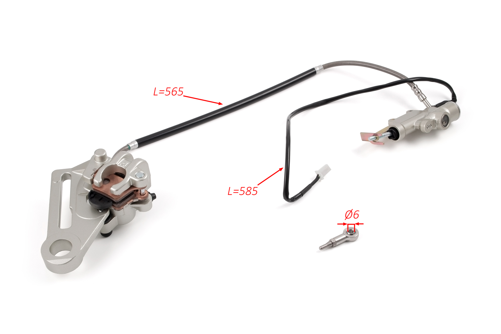 • В комплекте: главный тормозной цилиндр, суппорт, тормозные колодки, армированная гидролиния, крепёж, концевик под стоп-сигнал